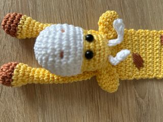 Segnalibro fatto a mano a forma di giraffa, ideale per gli amanti della lettura. - Realizzato all'uncinetto. - Colore giallo con macchie marroni. - Dettagli bianchi e marroni sul muso e sulle zampe.