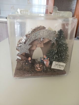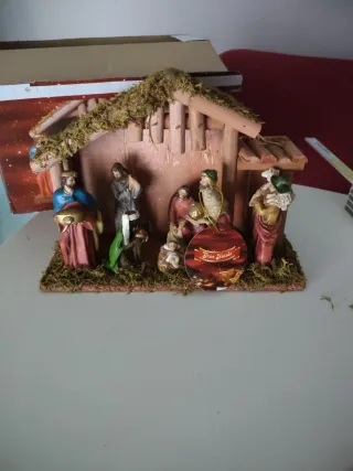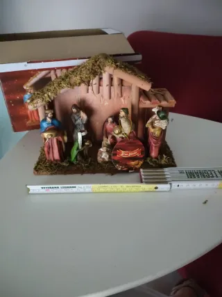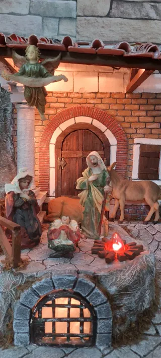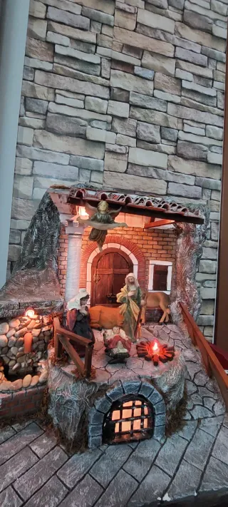 Bellissimo presepe è stato totalmente fatto a mano, dai pavimenti alle tegone Fontana funzionante. I materiali usati variano come legno, sughero, stucco, in più sono stati usati colori ad acqua. Adatto a statuine da 10 cm a statuineda 14 cm. Per qualsiasi informazione chiedete pure. - Struttura con tetto e mattoni. - Elementi decorativi come fuoco e inferriata. Le misure sono: Altezza 49 cm; Larghezza 52 cm; Profondità 44 cm.