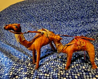 Due statuine artigianali di cammelli, perfette per arricchire il tuo presepe. -Realizzate in cuoio marrone. - Dettagli in corda e tessuto colorato sulla sella. Le statuette sono realizzate a mano in pelle conciata ,con cuciture visibili lungo ii bordi. Entrambe le figure hanno finiture decorative imitano briglie e selle, con frange e dettagli colorati. Questi cammelli sono spesso usati come decorazioni per la casa o come simboli di resistenza e superamento delle difficoltà, sono in pelle antiche di arte tribale Africana. Vendo in blocco a un ottimo prezzo di 30€ Le foto sono parte integrante della descrizione