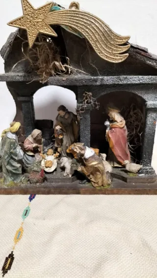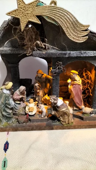 Bellissimo presepe completo di statuine e stella cometa decorativa. - Ambientazione suggestiva con dettagli curati. - Include figure sacre e animali. - Stella cometa dorata in rilievo. lucine con musica