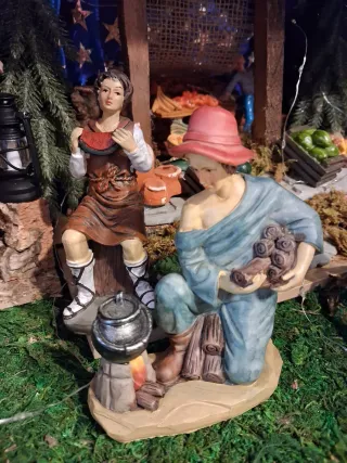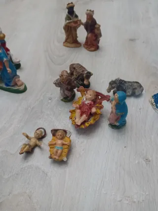 Lotto di statuine per presepe risalenti agli anni '80 in plastica - Diverse figure che compongono una scena. - Dettagli curati e colori vivaci.