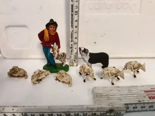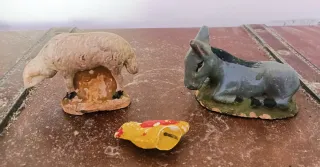 Set di tre statuine vintage per presepe. Anni 60/70. - Figura di donna con coniglio in braccio. 9,5x3,5 cm. Discrete condizioni vista l'età. Il braccio e il viso sono un po rotti. - Due figure di pecore. Discrete condizioni. Ad una pecora manca il rivestimento di una gamba. 4x4,5 cm. - Dettagli dipinti a mano.