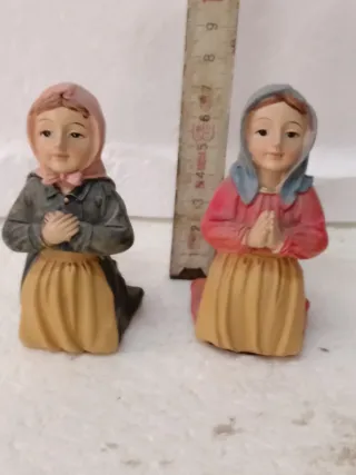 Due statuine per presepe. - Figure femminili in preghiera. - Indossano abiti tradizionali con copricapi. - Grembiuli color ocra. - Una con veste grigia e copricapo rosa, l'altra con veste rossa e copricapo azzurro.
