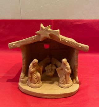 Piccolo presepe molto carino in terracotta con capanna e 5 statuine riposizionabili di cm 13 x 9 cm x h cm10,5. Nuovo, ancora nella sua scatola originaria. - Decorazione a forma di stella sulla sommità.