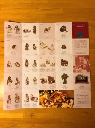Catalogo pieghevole originale Thun con doppia collezione: Presepe Classico e Collezione del Giubileo 2000. Il materiale è stampato fronte/retro a colori su carta patinata, con immagini dettagliate delle statuine, codici articolo, misure e prezzi di listino dell’epoca. La sezione dedicata al Presepe Classico mostra figure, animali e accessori della serie tradizionale, mentre il lato Giubileo presenta la linea commemorativa realizzata in occasione dell’anno 2000. Sono presenti alcune annotazioni a penna su diversi articoli. Le condizioni generali risultano buone: nessuno strappo visibile e pieghe compatibili con la consultazione
