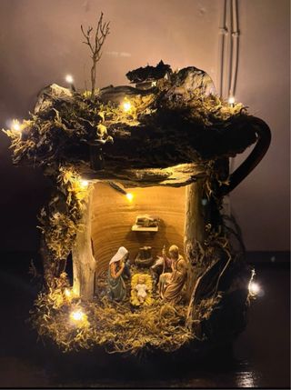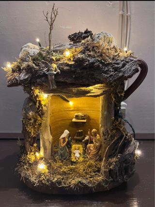 Bellissima Natività ambientata all'interno di un'anfora, con figure Moranduzzo. - Scena della Natività completa. - Dettagli curati delle statuine. - Elementi decorativi naturali come muschio e corteccia. - Illuminazione integrata con lucine LED.