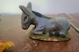 Set di statuine per presepe antichi fatti a mano e dipinti a mano Il set di tre pezzi include un asinello di terracotta cm 8 l. Una pecora di terracotta di cm 7,5x5,5 scheggiata sul mento come da foto. Una anatra da stagno in gesso di cm.3
