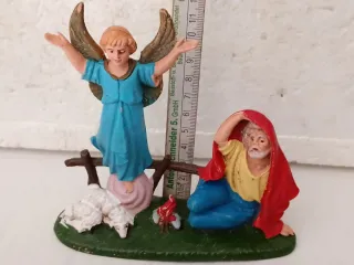 Set di statuine per presepe, raffiguranti un angelo, un pastore e pecore. - Personaggi dipinti a mano. - Base decorata con elementi naturali. - Ideale per creare un diorama. 222
