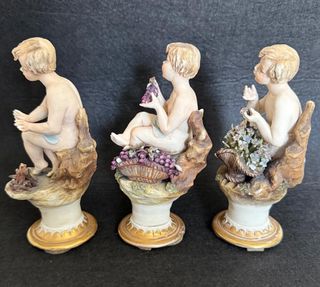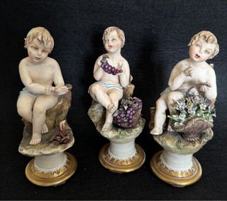 Set di tre antiche statuine in porcellana Capodimonte. Piccoli difetti consistenti in minuscoli pezzetti mancanti, guardare bene le foto - Realizzate in porcellana di alta qualità. - Raffigurano putti con cesti di frutta e fiori. - Base decorata con dettagli dorati.