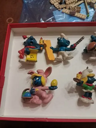 Set di statuine dei Puffi, risalenti agli anni '80 e '90. - Cinque statuine raffiguranti i Puffi. - Un Puffo con cappello da coniglio e uovo di Pasqua. - Un Puffo con candela e campanella. - Un Puffo con candela e supporto. - Un Puffo con spada. - Un Puffo con un panino.