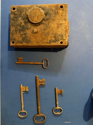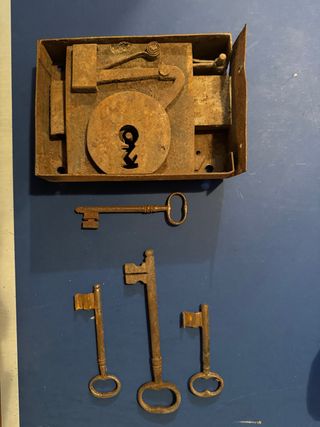 Set composto da una serratura antica in metallo arrugginito e quattro chiavi di diverse dimensioni. - Serratura con meccanismo visibile. - Quattro chiavi in metallo con finitura anticata.