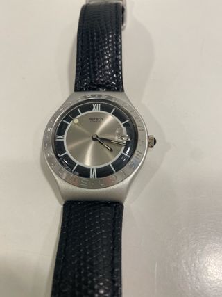 Orologio da polso Swatch modello Irony. È in alluminio, così come la fibbia, la batteria è nuova per la vendita, il bordo è girevole, deve cambiare il cinturino, è secco e screpolato.