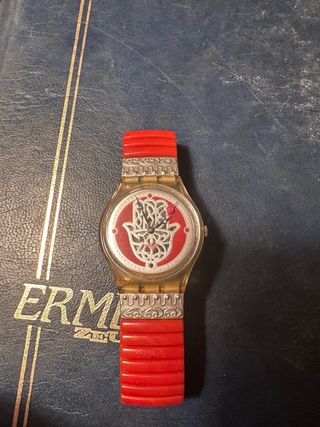 Orologio Swatch "Dehli" sigla GX125 anno 1993. Completo di cinturino aggiuntivo. - Cassa dorata. - Quadrante con decorazioni colorate. - Cinturino originale con motivo floreale. - Include un cinturino di ricambio. Nuovi. Mai indossati. Funzionante.