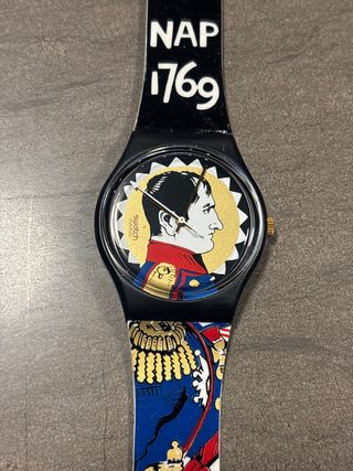 Orologio Swatch con design ispirato a Napoleone. - Quadrante con profilo dorato di Napoleone. - Cinturino con dettagli militari dorati e blu. - Scritta NAP 1769 sul cinturino.
