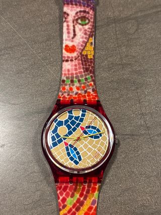 Orologio Swatch con un design artistico e colorato. - Cinturino con stampa di un volto stilizzato. - Quadrante decorato con motivi a mosaico e figure stilizzate. - Cassa e cinturino in plastica rossa trasparente.