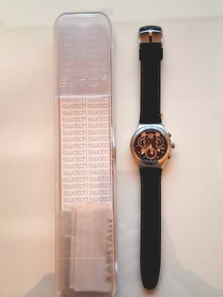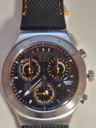 Cronografo perfettamente funzionante, uno degli Swatch Irony più iconici e ricercati. Stile sportivo-elegante senza tempo. Buone condizioni generali, presenti alcuni graffi su cassa e quadrante (vedi foto). Completo di custodia e garanzia originale. ❌ Non si accettano resi 📍 Ritiro a mano Milano Est o spedizione - Cassa in acciaio inossidabile. - Quadrante nero con dettagli arancioni. - Movimento al quarzo. - Cinturino in tessuto nero con cuciture arancioni.