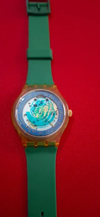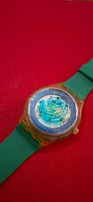 Orologio Swatch automatico con cinturino verde - Design con globo terrestre. - Movimento automatico visibile. - Cinturino in gomma verde. orologio swatch automatic earth summit 92 swiss automatic moviment perfettamente funzionante cinturino non originale nuovo mai usato visto e piaciuto