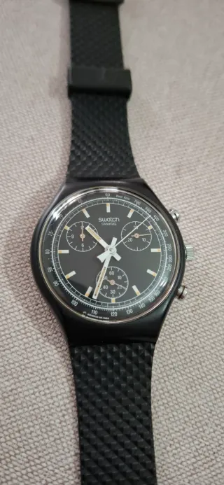 Swatch Chrono "Wall Street", numero di referenza SCB106. modello appartiene alla prima serie Chrono lanciata da Swatch nel 1991. Design: Presenta un quadrante nero con tre contatori cronografici, lancette chiare per una facile lettura Movimento: È dotato di un movimento al quarzo svizzero Funzionante Cassa: Ha una dimensione classica di 37 mm. Cinturino: Originariamente venduto con un cinturino in pelle nera, l'esemplare in vendita monta un cinturino in gomma forato swatch