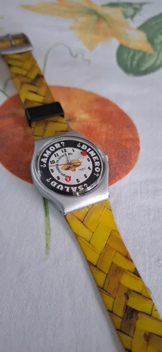 Swatch Standard Gent chiamato "Sombrero" (referenza GM143), appartenente alla collezione del 1998. Questo segnatempo vintage degli anni '90 si distingue per il suo design ironico e colorato: Quadrante: Presenta uno stile "Western" con le scritte in spagnolo "¿AMOR?", "¿DINERO?" e "¿SALUD?" (Amore, Denaro e Salute). Al centro spicca la figura di un uomo con un sombrero. Dettagli dell'ora: Presenta numeri neri e lancette bianche, con la lancetta dei minuti che termina con un punto rosso e il numero 7 evidenziato in rosso. Sul quadrante compare anche la frase "energia positiva 24 horas al dia". Cinturino: Il cinturino in plastica