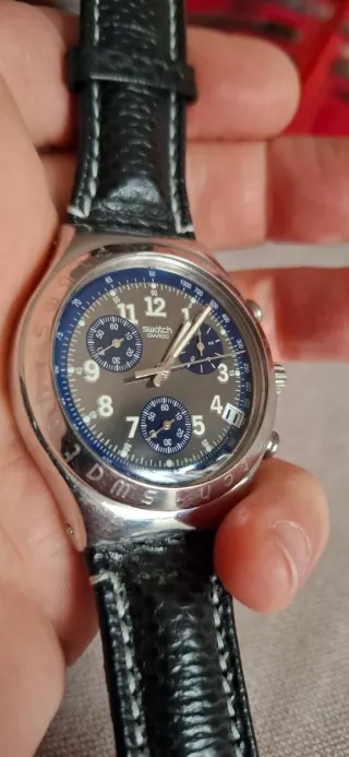 Swatch Irony Chrono, modello Secret Agent Red (referenza YCS405). Collezione: Fa parte della linea Irony Chrono, introdotta originariamente alla fine degli anni '90 (circa 1997-1998). Cassa: Realizzata in acciaio inossidabile con un diametro di circa 40 mm. Quadrante: Di colore rosso con contatori cronografici blu e datario posizionato a ore 4. Movimento: Movimento cronografico al quarzo prodotto da ETA perfettamente funzionante Cinturino: Originariamente venduto con un cinturino in pelle rossa, oppure con un bracciale in acciaio. L'esemplare nella foto monta un cinturino in pelle blu Swatch nuovo mai indossato