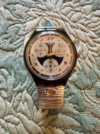 Swatch Swiss crono da collezione anni 80-90 usato, mantenuto benissimo funzionante, con bracciale dorato con due pietre blu, di cui una persa. Senza un graffio. Solo tappo batteria da sostituire un po’ usurato nel tempo.