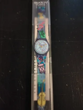 Orologio Swatch Quartz con cinturino colorato. - Design vivace con motivi musicali. - Chiusura a fibbia.