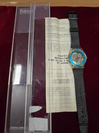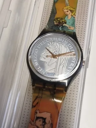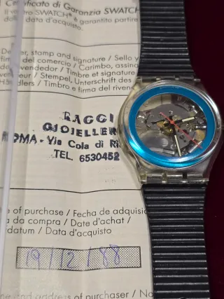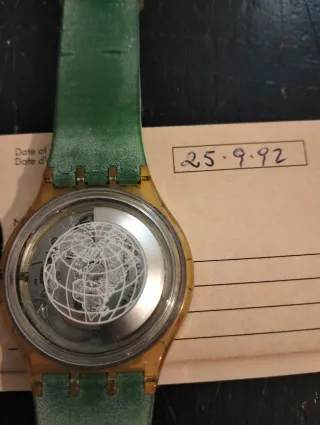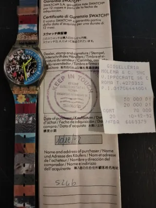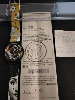 Orologio Swatch con certificato di garanzia originale. - Design con stampa a tema. - Documentazione di acquisto inclusa. - Data di acquisto: 11-01-93.