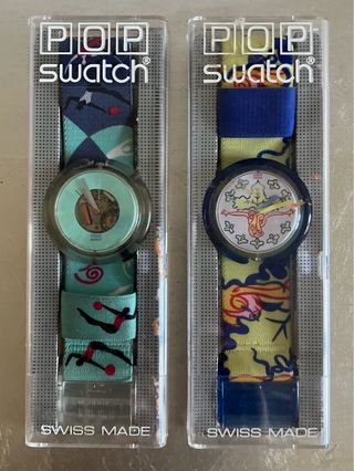 Due orologi Swatch POP vintage, perfetti per collezionisti o per chi ama gli accessori unici. - Design colorato e distintivo. - Modelli SWISS MADE. - Gli orologi in vendita sono quelli fotografati, entrambi nuovi, con leggero alone sui cinturini, caratteristica naturale del vintage.