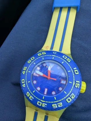 Orologio Swatch Scuba con cinturino giallo e blu. - Quadrante blu. - Lunetta girevole blu con numeri gialli. - Dettagli a righe blu sul cinturino giallo.Scuba originale SWATCH senza scatola e scontrino. Leggeri segni di usura, perfettamente funzionante con batteria originale Swatch.