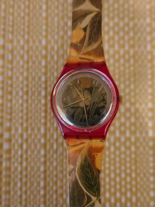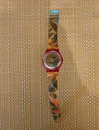 Orologio Swatch Gent La Vie En Rose del 1994. Il cinturino presenta una stampa di foglie autunnali. - Cassa in plastica rossa. - Quadrante con disegno floreale. - Cinturino con motivo foglie autunnali. - Compresa di pila funzionante