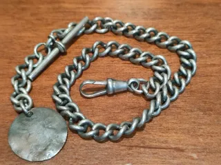Catena in Argento Nichelato Galvanico (Electro Plated Nickel Silver) per orologio da tasca, con chiusura a moschettone e una piccola moneta decorativa (probabilmente in metallo povero). Manifattura inglese di inizio 1900. Il peso è leggermente oltre i 26 gr. - Lunghezza della catena: 30 cm circa - Materiale: EPNS - Chiusura: Moschettone - Accessorio: Moneta decorativa