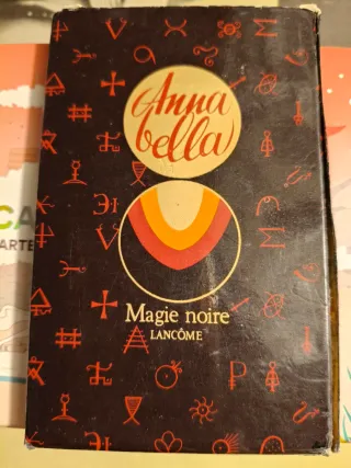 Mazzo di tarocchi Annabella con Arcani Maggiori. - Copertina nera con simboli rossi. - Cerchio dorato con scritte Anna bella. - Cerchio con colori arancione, rosso e giallo.