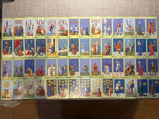 Mazzo di Tarocchi, edizione Visconti-Sforza. Mai Usato con energia neutra quindi. 2 carte sono leggermente sbiadite come appare il 3 di denari nella prima foto in basso a destra. 6x11cm. Senza scatola - Carte illustrate con disegni tradizionali. - Include arcani maggiori e minori.