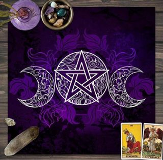 Tappeto in velluto viola per lettura dei tarocchi. Presenta un design mistico con un pentagramma centrale e lune crescenti. Materiale: Velluto. Colore: Viola. Design: Pentagramma e lune. Ideale per rituali e letture dei tarocchi.
