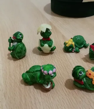 Set di 7 sorpresine Kinder a tema tartarughe. - Tartaruga con cappello di fiori e ciotola. - Tartaruga che mangia anguria. - Tartaruga con banana e fragole. - Tartaruga che esce dall'uovo. - Tartaruga con remo manca pagoda - Tartaruga con frutta. - Tartaruga con guscio verde.