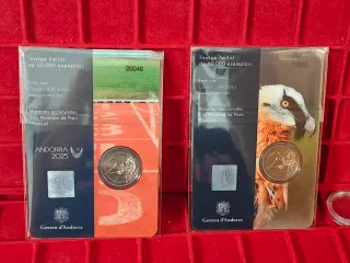 Due monete da 2 Euro di Andorra del 2025, in emissione ufficiale. - Una moneta celebra i Jocs dels Petits Estats d'Europa con un'immagine di una pista di atletica. - L'altra moneta raffigura un Trencalòs (Gipeto), un uccello rapace. - Entrambe le monete sono presentate in blister ufficiali.