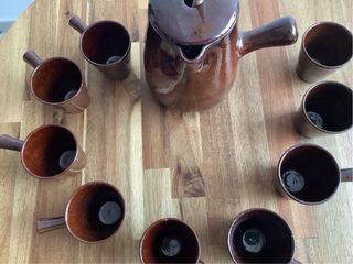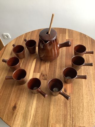 Set di ceramica in marrone scuro, ideale per servire bevande. Include una grande caraffa, diverse tazze abbinate e un cucchiaio.