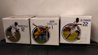 Set di tazze con immagini dei giocatori del Real Madrid. - Tazza di Marcelo (numero 12). - Tazza di Iker Casillas (numero 1). - Tazza di Di María (numero 22).