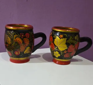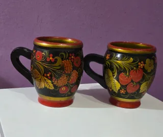 Set di 2 tazze russe. Realizzate in URSS (anni '70-'80). Splendide tazze in legno laccato con decorazione tradizionale russa (stile Khokhloma), con etichetta originale 'Made in USSR'. Dimensioni: circa 10 x 6 cm. Decorazione floreale e frutti in toni dorati, rossi e neri. Le 2 tazze costano 18 euro. Non vendute separatamente.