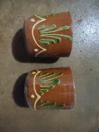 Set di due vecchie tazze in terracotta con un design decorativo. Materiale: terracotta. Colore: terracotta con dettagli in verde e crema. Design: motivi vegetali e geometrici.