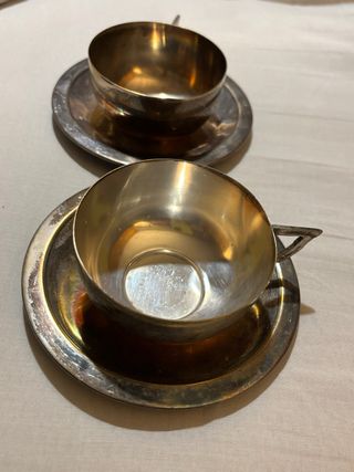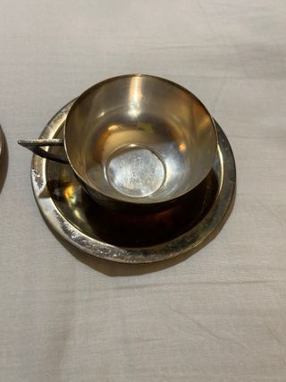 Elegante set di tazze e piatti. Realizzato in argento e alpaca. Cucchiaio Bucherer 18€ Vassoio alpaca 30€ 2 Tazze e 2 piatti + 2 cucchiaini, argento 150€