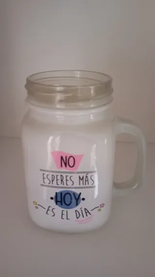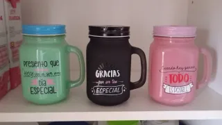 Set di 4 tazze di vetro tipo mason jar con coperchi colorati e frasi ispiratrici. - Tazza verde con coperchio blu: Sento che oggi sarà una giornata speciale. - Tazza nera con coperchio nero: Grazie per essere così speciale. - Tazza rosa con coperchio rosa: Quando c'è voglia, tutto è possibile. Ideali per bevande fredde o come elementi decorativi.