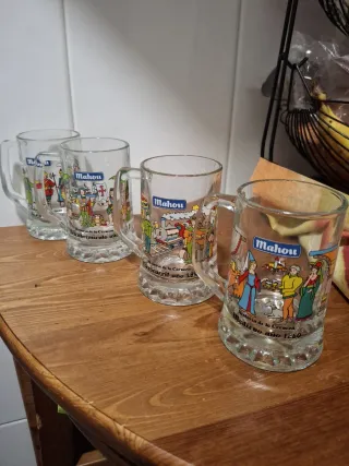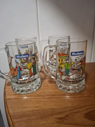 Set di quattro tazze di birra Mahou con design che illustrano la storia della birra. Anno 1654 in Russia, scoperta nel 1492, ferrovia nel 1830, Medioevo nel 1260. Le 4 tazze a 10€.