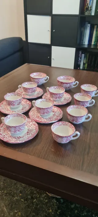 Set di tazze e piatti da tè di La Cartuja de Sevilla Pickman S.A, modello Aurora 202 Rosa. Servizio vintage dei primi del XX secolo. Include 5 piatti da 15 cm, 9 tazze piccole da 9x5 cm, 2 tazze medine da 10x5 cm. Una tazza ha l'impugnatura riparata e un piatto ha un piccolo urto. Totale 16 pezzi. In perfette condizioni considerando l'età. Altri modelli disponibili nel mio profilo. Ideale per ampliare la tua collezione di stoviglie fine di La Cartuja de Sevilla. Perfetto per collezionisti o come regalo originale. Si accettano lotti su misura con qualsiasi articolo del mio profilo.