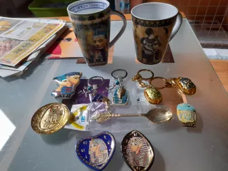 Set di souvenir tematici sull'Egitto. - Due tazze decorate con Nefertiti e scene egizie (15€ unità) - 4 portachiavi (10€ unità) - 8 magneti (6€ unità) - Cucchiaino dorato (12€ unità) Il lotto si vende intero.