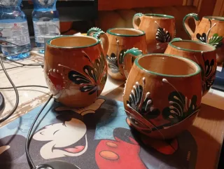 Set di sei tazze in terracotta decorate a mano. - Design vintage unico. - Finitura smaltata colorata. - Manici ergonomici.