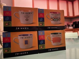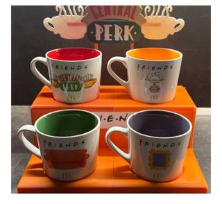Set di 4 tazze da collezione McDonald's della serie Friends. Inclusa Personaggio di Ross in regalo - Design ispirato alla serie TV Friends. - Logo McDonald's presente su ogni tazza. - Materiale: ceramica.