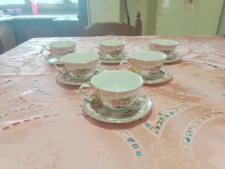 Elegante servizio da sei tazze da tè, perfette per collezionisti. - Design floreale con rose. - Bordi e manici dorati. - Tazze e piattini coordinati.