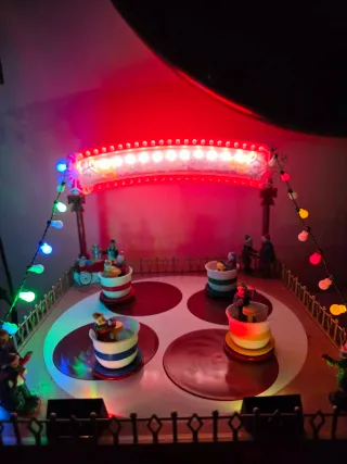 Attrazione di tazze da fiera con figure e luci. Ha già il suo tempo. La musica suona ma non molto forte. Funziona con luci e batterie. Base circolare con quattro tazze. Figure di persone in ogni tazza. Luci LED decorative.