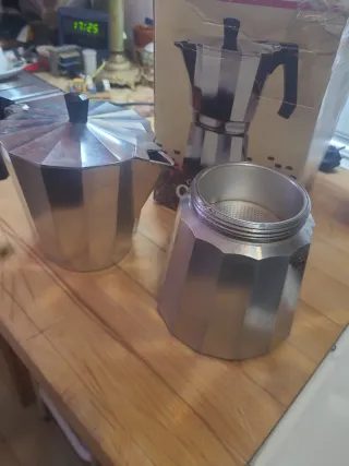 Cafetera italiana Oroley da 12 tazze, un classico design vintage. Fabbricata in alluminio. Manico e maniglia in bakelite nera. Design ottagonale caratteristico. Con pochissimo utilizzo, molti anni in armadietto. Spedizione e pagamento tramite l'applicazione.